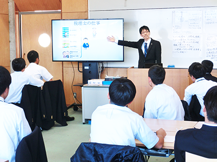 豊橋南高校で行っているアクティブラーニング形式の「消費税の逆進性の打開案は?」と、税理士の職業紹介の授業を行いました。班ごとに意見出して発表するのですが、対数関数logを用いて消費税の税率を算出する計算式の案や、哲学・思想から「逆進性」とう議題自体を考える意見がでるなど、発表を聞いている私達が感心する内容や、新たな考え・面白い意見を聞くことができました。